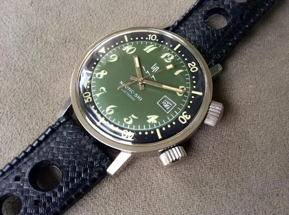 Sie denken wahrscheinlich, eine Taucheruhr zu rufen, der "Nautic-Ski" ist ziemlich merkwürdig. Der Name stammt von der Leidenschaft, die der CEO der französischen Firma Lip zum Skifahren hatte. Diese Uhr wurde 1967 anlässlich des 100-jährigen Firmenjubiläums aufgelegt und war zu der Zeit ein Wunderwerk der Ingenieurskunst mit einem elektromechanischen Uhrwerk und einer Wasserbeständigkeit von 200 m. Letzteres wurde tatsächlich durch einen exklusiven Fall von Piquerez erreicht, der das Patent für das Superkompressor-Prinzip (die Verwendung von Wasserdruck auf die Dichtung zum Abdichten des Gehäuses) besaß. Der Nautic Ski wurde in verschiedenen Farben auf Vorschlag eines französischen Modedesigners angeboten, mit Zifferblättern in Grau, Orange, Violett, Blau und, neben den seltensten Exemplaren, grün mit diesen ungewöhnlichen arabischen Ziffern. Ich hätte erwartet, dass das Mobilteil in seiner charakteristischen Pfeilform wäre, obwohl die Taktstockhände auch für dieses Modell von Lip möglich sind, und die patinierte Leuchtmasse hier scheint zu zeigen, dass sie von Anfang an auf der Uhr montiert waren.